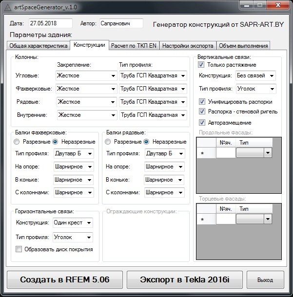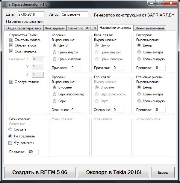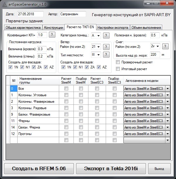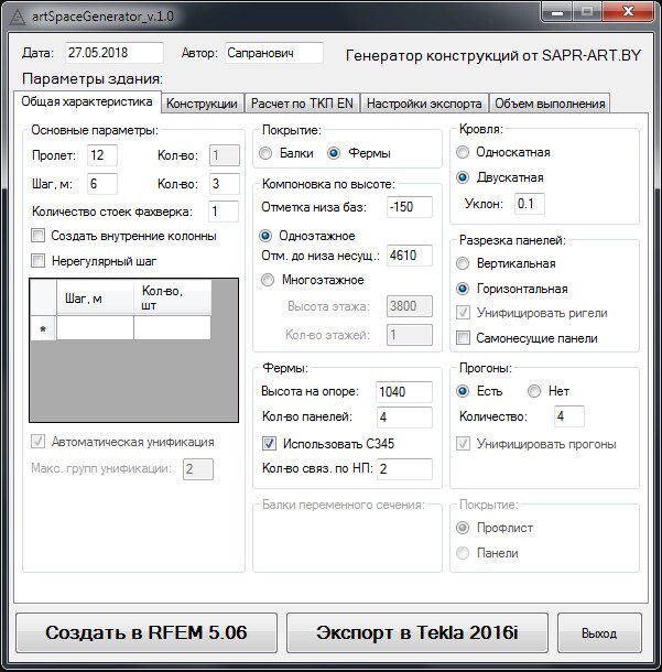 SpaceGenerator - собственная разработка для автоматизации проектирования. Позволяет в несколько кликов моделировать, рассчитывать и получать документацию для стальных зданий всевозможных конфигураций. На данный момент выполнена в виде приложения и интегрирована с программами Dlubal RFEM и Tekla Structures.
