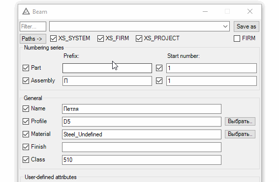 По умолчанию Tekla читает свойства из всех папок, удаляет дублирующиеся имена, загружает атрибуты согласно системной иерархии (SYSTEM → FIRM → PROJECT → /attributes). Плагины SAPR-ART оснащены возможностью загружать свойства из каждой папки по выбору.